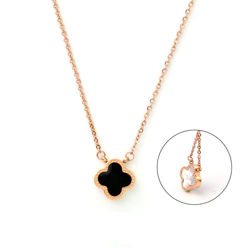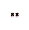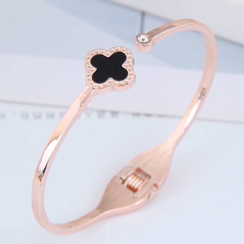 Copper Clover features a four-leaf stem necklace showcasing a black front and a mother-of-pearl back. It includes coordinating black four-leaf clover earrings with copper posts. The copper clover bracelet complements the set and opens with a pull-apart design, fitting all sizes comfortably.