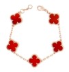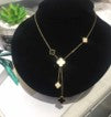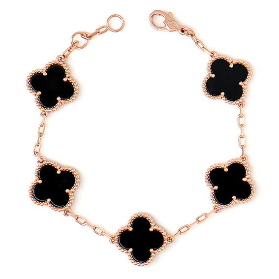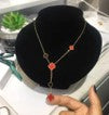 Layered in Clovers presents a four-leaf stem layered necklace available with a black front paired with a mother-of-pearl back, or a red front with a black back. The set includes matching black four-leaf clover earrings featuring gold posts, along with a versatile bracelet designed to fit all wrist sizes comfortably. Selecting the black option delivers the black/mother-of-pearl necklace, black earrings, and bracelet, while the red choice provides the black/red necklace with coordinating red earrings and bracelet.